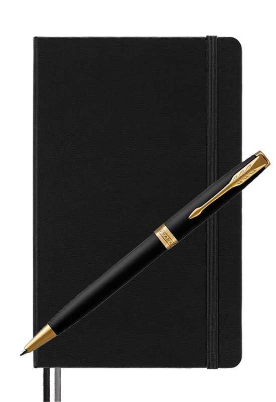 Parker Sonnet Matte Black Gt Moleskine от официального дилера Parker в Иркутске. Вы можете дополнительно заказать гравировку, которая подчеркнет Вашу оригинальность и придаст памятность статусному подарку. Все ручки Паркер поставляются в фирменном футляре.